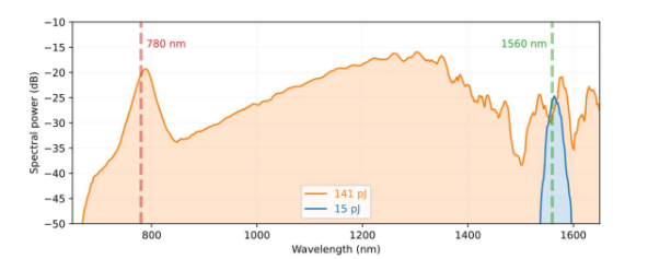Octave Photonics 超连续谱模块的输出使用 1560 nm 输入(PM780 输出光纤)生成 780 nm 光。 在低脉冲能量 (15 pJ) 下,光谱相对较窄。 对于高于 140 pJ 的脉冲能量,会产生峰值为 780 nm 的宽带光,可用于激光频率梳的 fceo 检测。 (请注意,模块的输出具有 PM780 nm 光纤,波长超过 ~1300 nm 的光会部分衰减。可根据要求提供替代输出光纤。)